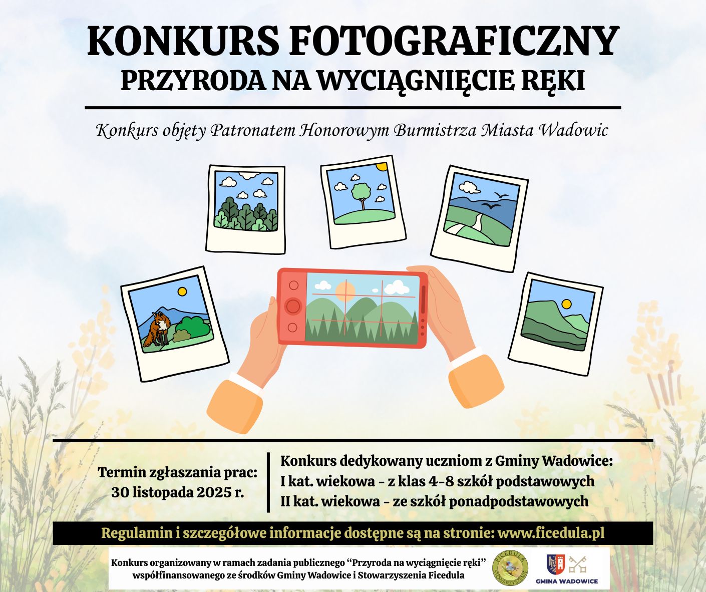 Konkurs jest realizowany ze środków Gminy Wadowice i Stowarzyszenia Ficedula w ramach realizacji zadania publicznego pn. „Przyroda na wyciągnięcie ręki”.